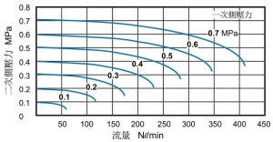 图中曲线与标注数值:每条曲线对应一个固定的一次侧压力(电磁阀进气口的输入压力),标注的 0.1MPa~0.7MPa,就是阀进气端给定的恒定输入压力,也是该系列阀的额定使用压力范围。