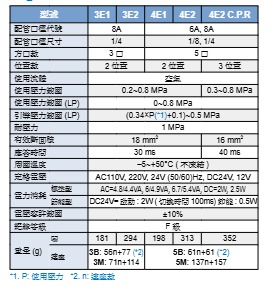 结构与接口:3E1/3E2 为 3 口 2 位置,仅适配 8A(1/4 英寸)配管口径;4E1/4E2 为 5 口 2 位置、4E2 C.P.R 为 5 口 3 位置,4E 系列适配 6A(1/8 英寸)/8A(1/4 英寸)口径,全系列仅适用于空气流体。